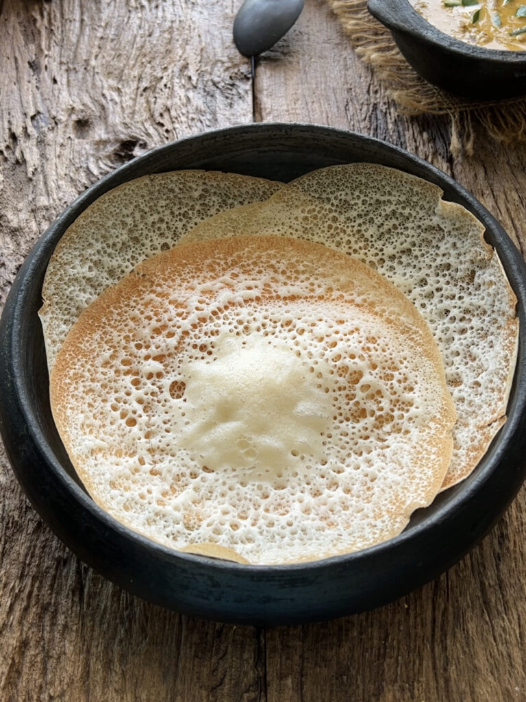 Appam is a constant in the Kerala household. This foolproof recipe(with a twist) will guide you to perfect appams with thin, crispy edges and soft, fluffy centres!