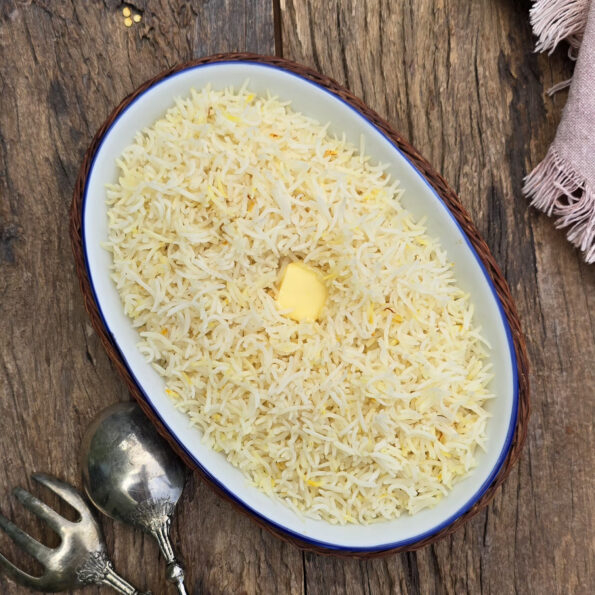 Once cooked, switch off the heat. Drizzle saffron water and butter over the rice and gently fluff the rice.